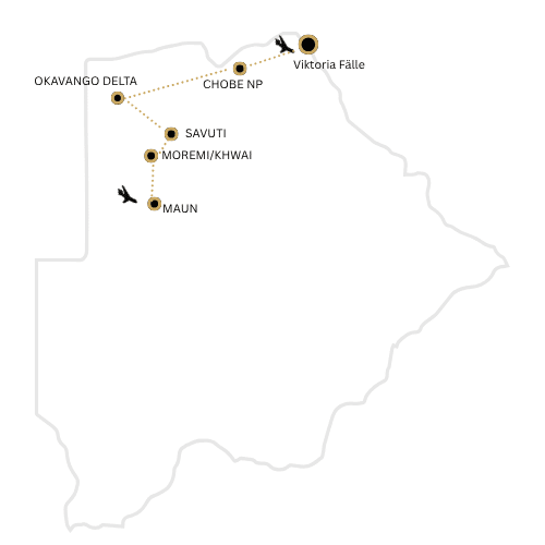 Sie reisen von Maun in die wildreiche Khwai Region und ins Moremi Game Reserve, erleben die legendäre Savuti Region, entdecken den Chobe Nationalpark und lassen Ihre Reise an den beeindruckenden Victoria Falls ausklingen.